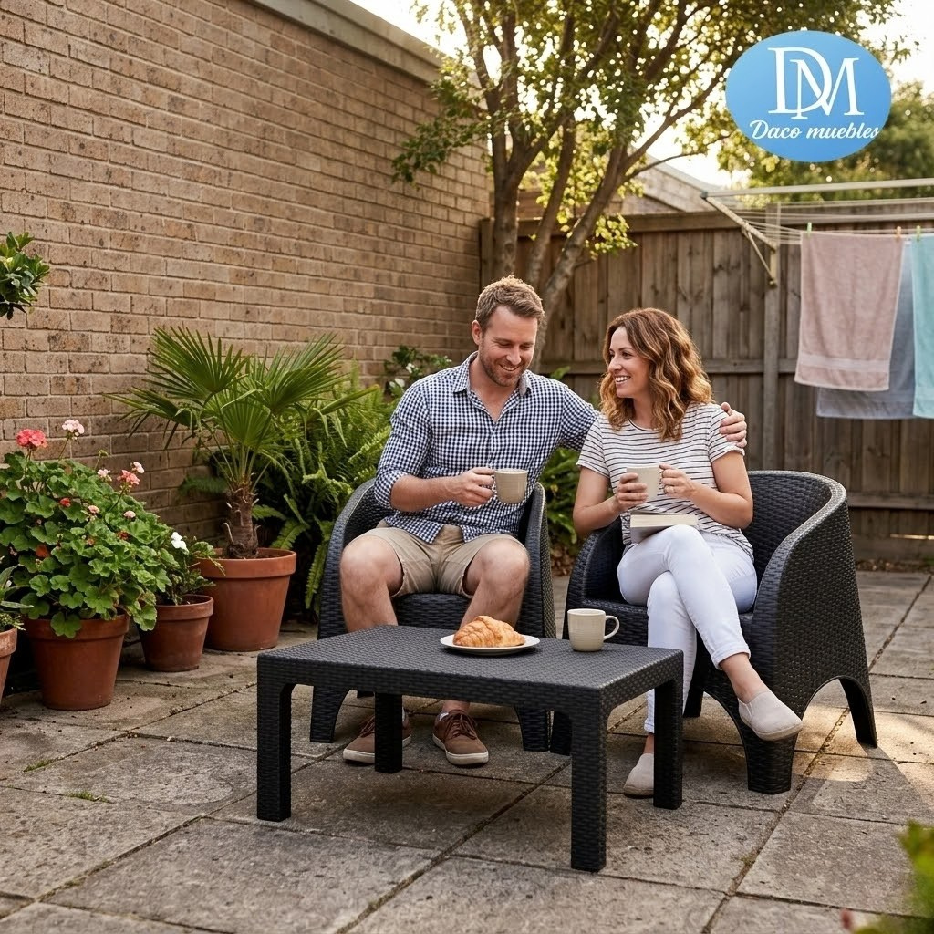 Balcones y patios modernos: Al ser un combo compacto pero con mucha presencia, es ideal para quienes quieren lujo y comodidad sin ocupar el espacio de un juego de comedor gigante.
